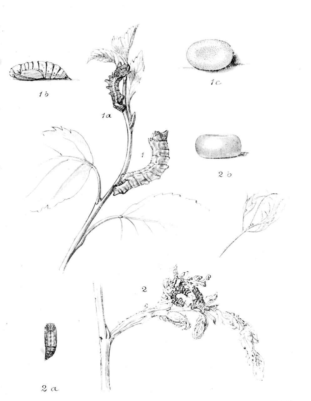 The caterpillar is pale dingy green, dusted with whitish, and yellow between the rings; three white lines along the back, and a double white line along the region of the purplish-edged white spiracles; head, pale yellow, the jaws black, and a small red {6}spot on each side above them. (Adapted from Porritt.) It feeds, from April to June, on the foliage of birch and aspen, and may be found in the daytime between the lower leaves.