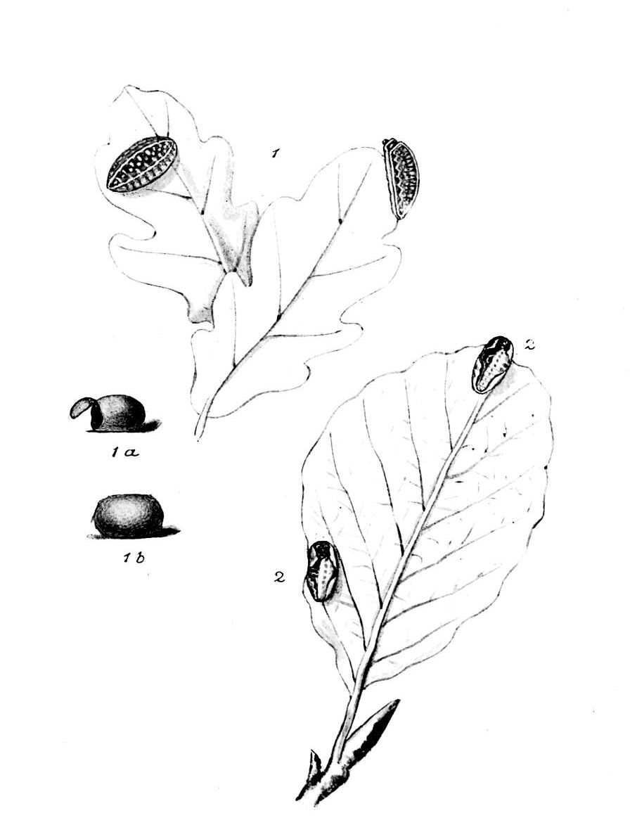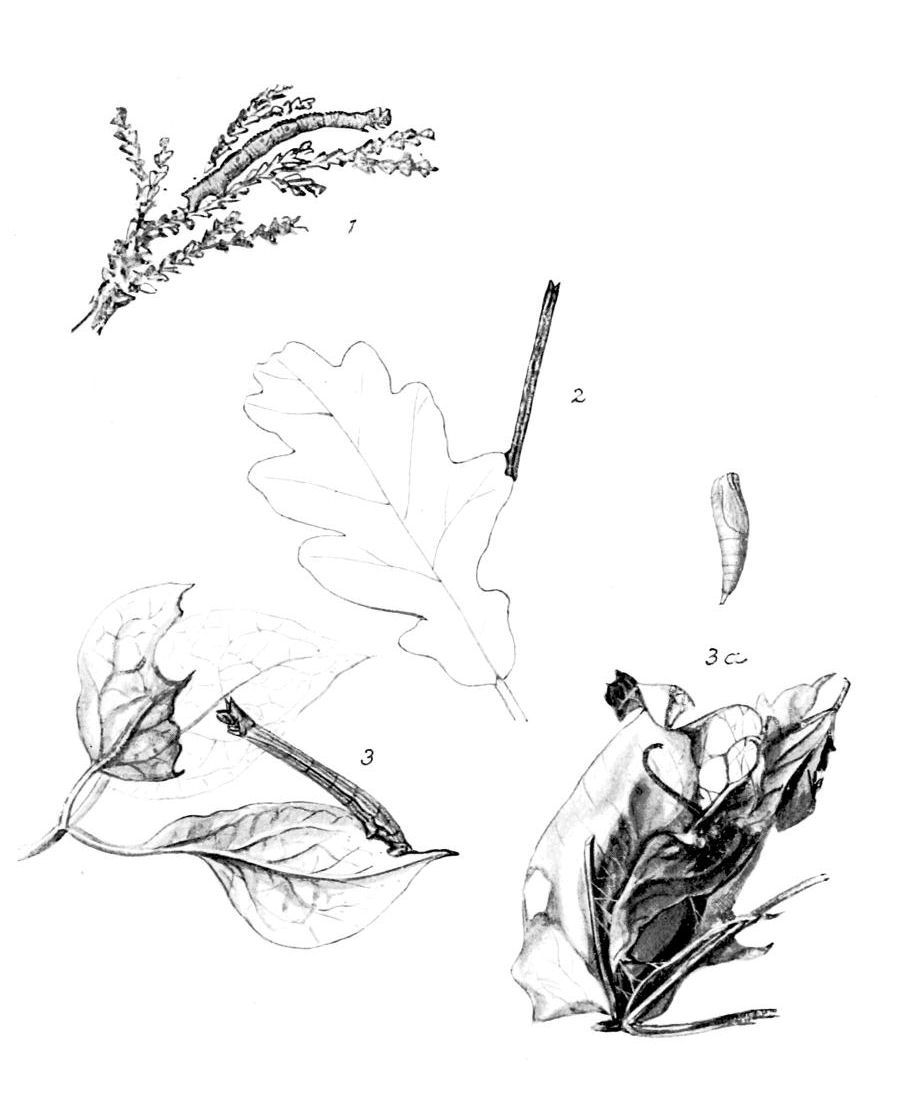 The caterpillar, which feeds from April to early June on the foliage of the oak, is black above and brownish beneath; there are three white lines on the back, the central one widest and more or less interrupted; the stripe along the black-outlined reddish spiracles is yellowish-white; head, and plate on first ring of the body, black and shining.