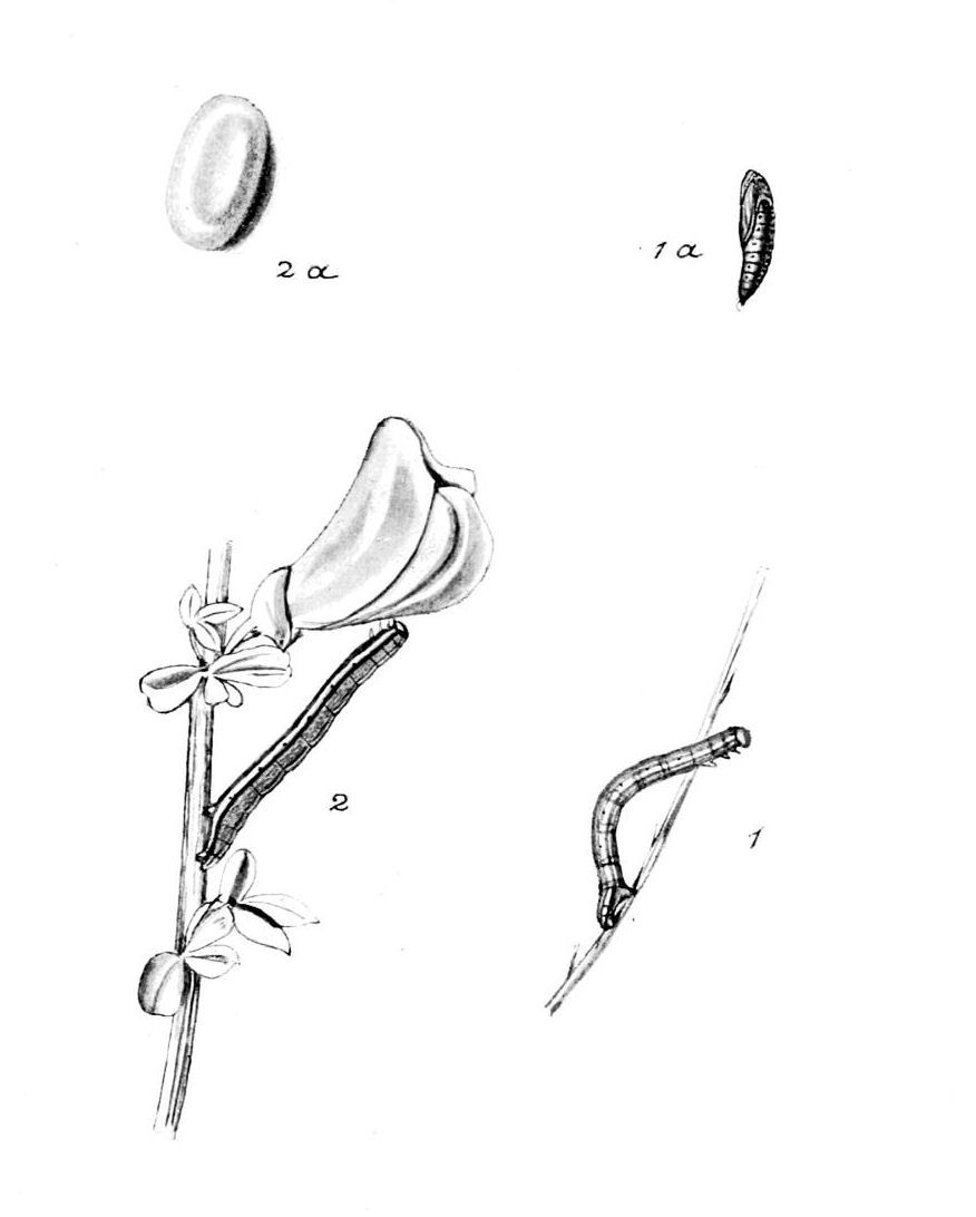 When newly laid the egg (Plate 5, Fig. 1a) is yellowish, but changes to olive-brown. The caterpillar (Plate 5, Fig. 1) is green inclining to yellowish, freckled with greyish, and dotted with whitish; there are three fine whitish lines along the back, and a broad white stripe along the sides. It is found from March to June, and feeds on grasses, dandelion, groundsel, buttercup, and a variety of low plants; it will also eat sallow.