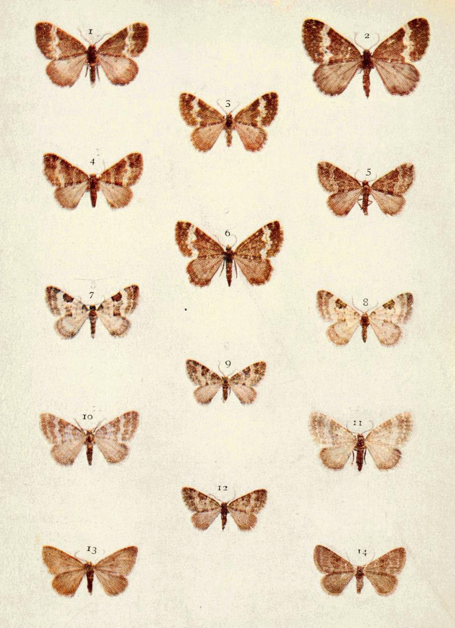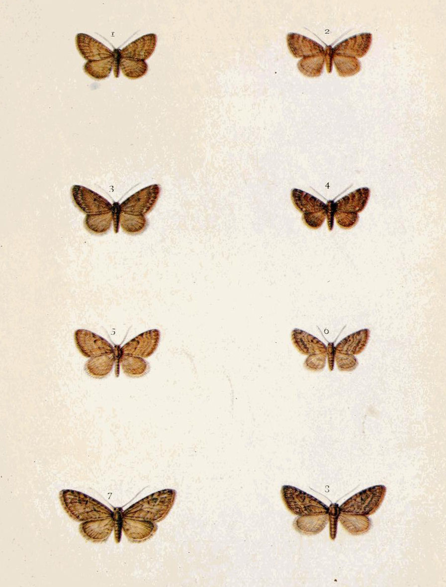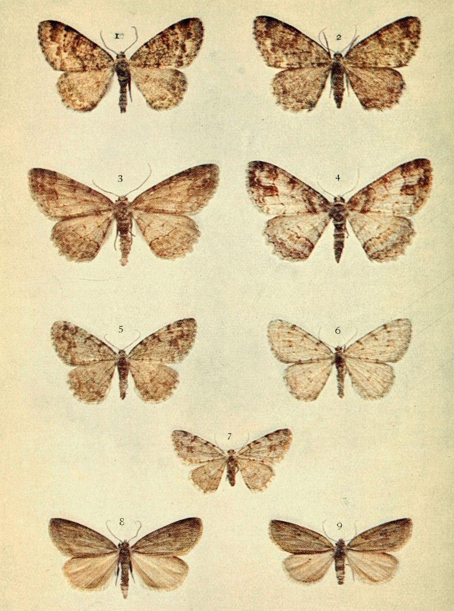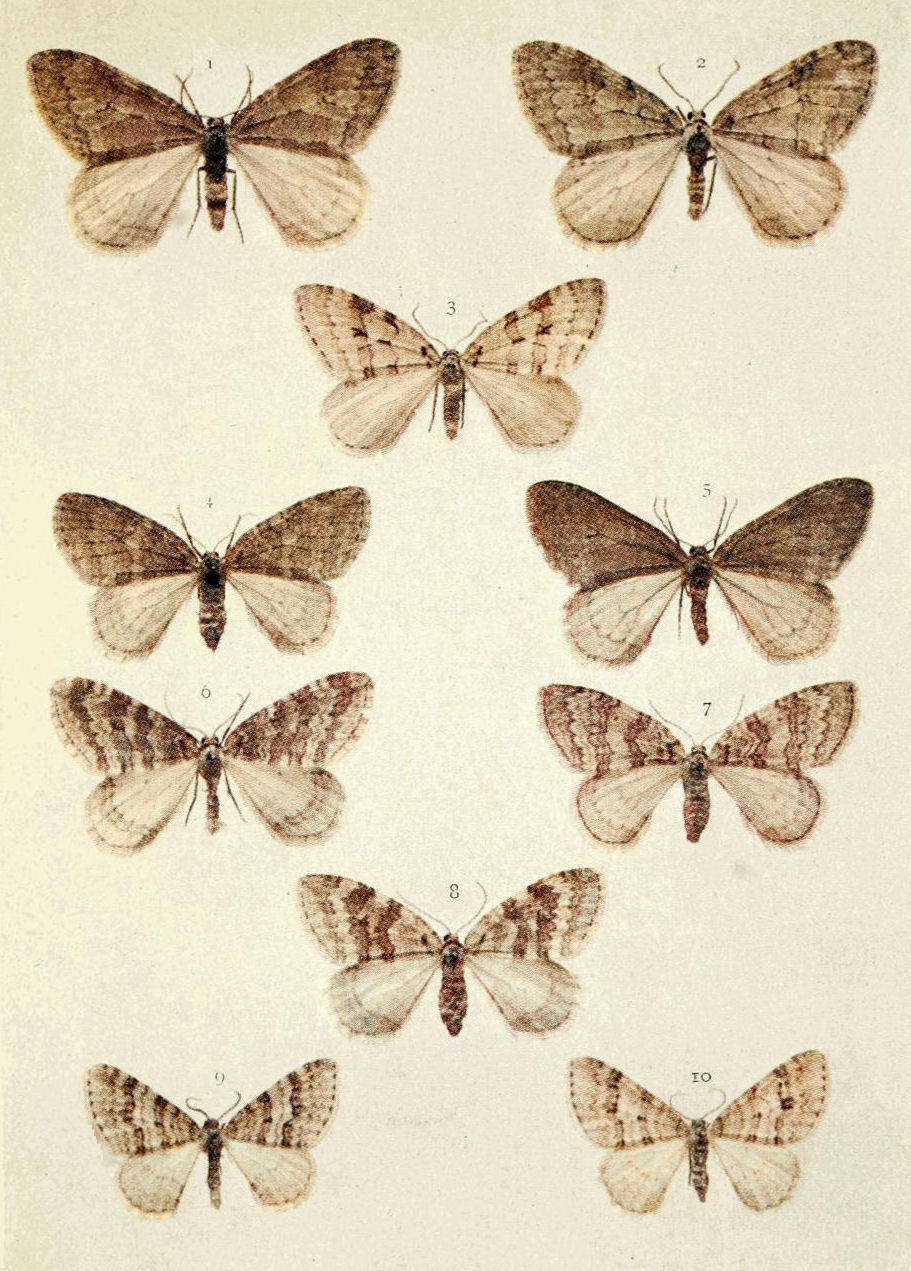 On Plate 9 are shown specimens from Scotland (Figs. 8 ♂, 9 ♀). The male, which has the basal area of the fore wings pale, is referable to ab. borealis, Sparre-Schneider, whilst the female is more nearly typical. In England the majority of the {17}specimens belong to ab. rufa, Tutt, which is reddish in the coloration of fore wing (Fig. 7). Sometimes the basal area in this colour form is pale also.
