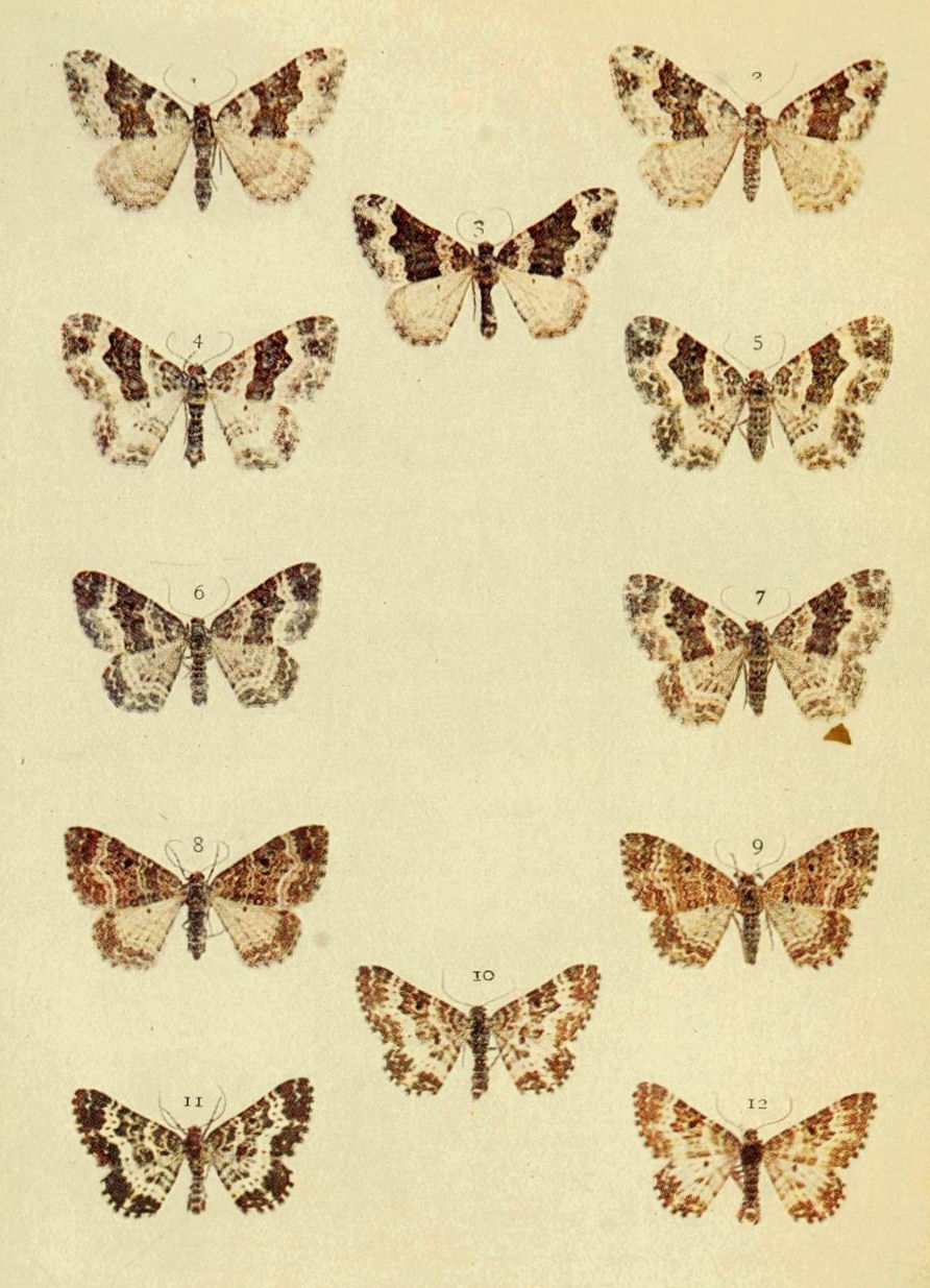 In some examples of this species (Plate 10, Figs. 4, 5) the oblique band of the fore wings is purplish, and in others red or reddish; the former are typical, and the latter are referable to ab. ochreago, Borkhausen. Often the band is incomplete, and sometimes it is only indicated by three more or less regular series of reddish dots (ab. togata, Esper). I have one example of this form from the Isle of Hoy, and another specimen from the same locality is somewhat similar, but the spots are not so well separated, and are purplish in colour.