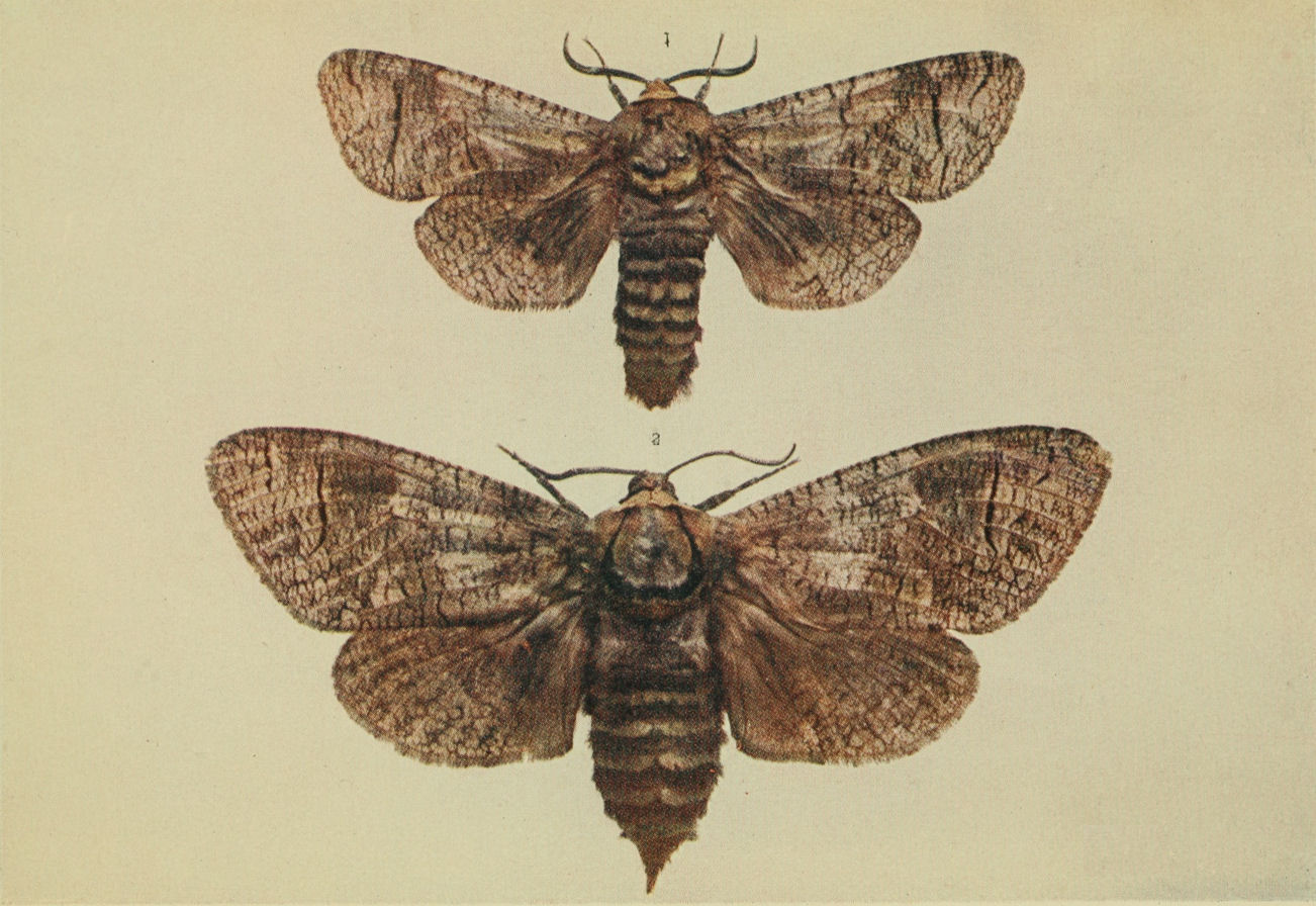 The caterpillar is brown, sometimes inclining to reddish marked with black above, and the under surface is paler; there are three pale lines along the back, and one low down along each side; head, pale brown freckled with darker brown. It feeds in April and May on willows, chiefly the narrow-leaved kind, and also, although less frequently perhaps, on poplar. These caterpillars may often be found in the daytime under loose bark of the willow, or lurking among grass roots or débris around the trunk. (Fig. 1 on Plate 3 is from a coloured drawing by Mr. A. Sich.)
