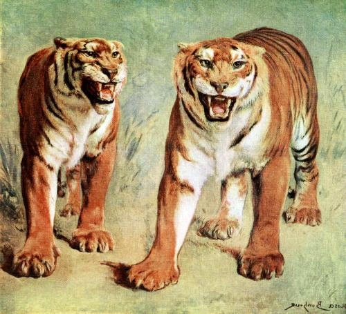 Rosa Bonheur spent entire days in the Jardin des Plantes, or in menageries in order to catch the attitudes and the mobile physiognomies of the beasts of prey. Accordingly no other artist has attained such perfect truth, as is shown in the tigers here portrayed.