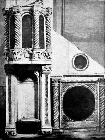 We shall see that all that was architecturally good in Italy during the dark centuries between 500 and 1200 A.D. was due to the Comacine Masters, or to their influence. To them can be traced the building of those fine Lombard Basilicas of S. Ambrogio at Milan, Theodolinda's church at Monza, S. Fedele at Como, San Michele at Pavia, and San Vitale at Ravenna; as well as the florid cathedrals of Pisa, Lucca, Milan, Arezzo, Brescia, etc. Their hand was in the grand Basilicas of S. Agnese, S. Lorenzo, S. Clemente, and others in Rome, and in the wondrous cloisters and aisles of Monreale and Palermo.