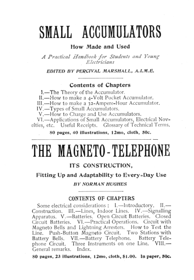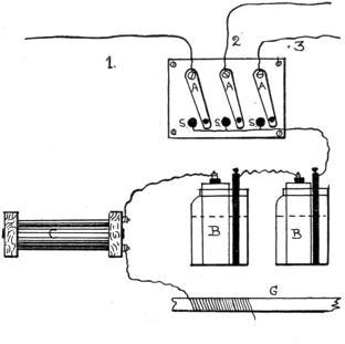 | Electrical Rules—Electromotive force—Amperes—Resistance—Selecting a battery—Arrangement of battery—Series—Multiple—How to get high voltage or large current—The Leclanche Cell—The Samson Cell—The Dry Cell and how to make one—The Edison-Lalande Cell—The Fuller Cell—Care and maintenance of batteries | 78 |