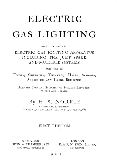 The Electric Light possesses the great advantage over gas, in that it can be turned on or lighted from a distance. The customary means of igniting gas with a match or taper is both dangerous and often inconvenient. The inventive genius of modern times has evolved a means of lighting gas by electricity which is both reliable and easy of application. It requires no very complicated devices, nor does it necessitate a deep knowledge of electrical matters for its installation. The object of the following pages is to enable any one possessing ordinary mechanical ability to construct much of the apparatus used, or at least to successfully erect it and keep it in operation.