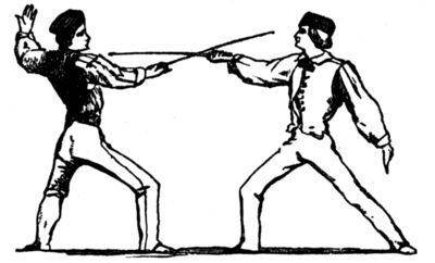 It is customary for adversaries, on coming to[Pg 10] the Guard, to Engage, or to join blades, on what is called the inside, that is, the right side; although there are occasions on which it is advisable to engage on the outside, or on the left; otherwise called the Quarte or Tierce sides.