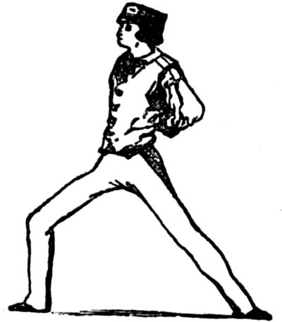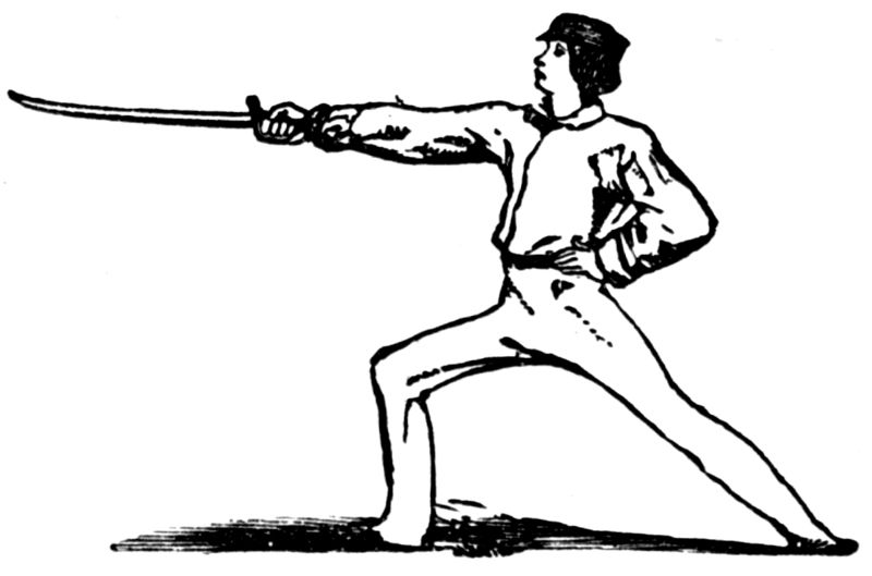 is a very important movement, and is rather difficult to make properly, and fatiguing to practice. Indeed, the first movements in fencing are the most trying to the learner; and he must not be discouraged if he fails to do them correctly at first—practice only will give him this power. The Longe is that extension of body which accompanies every attack, and is thus made:—The right[Pg 9] arm is extended straight from the shoulder, the arm and blade being on the same level; by a second movement, the right foot is raised from the ground, and a step made forward, about eighteen inches in length, while the left remains firmly planted in its place. At the instant that this step is made, the left hand is allowed to fall within a few inches of the left thigh, and the left knee is stiffened back until the leg is perfectly straight.