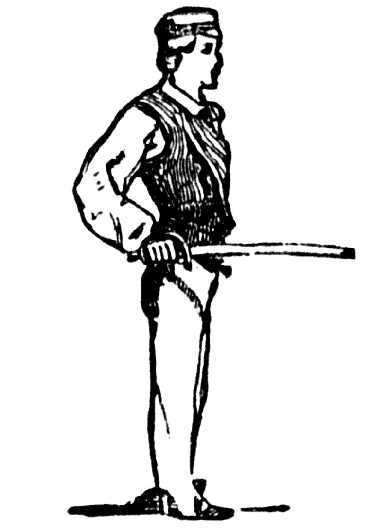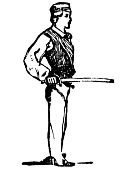 It is from this position that all movements are made, whether offensive or defensive. Let the beginner be placed with his knees straight, his feet at right angles, heel to heel; the right foot, right side, and face directed to the master. The body must be held upright and firm, the arms hanging down by the side, but easily and without constraint, the left hand holding the foil a few inches beneath its guard. Next, let him bring the right hand across the body, and seize the foil-handle; by a second movement, bring the foil above the head, the hands separating as they ascend, until both arms be nearly extended upwards and outwards. Here pause. This may be called the first position of the Guard.