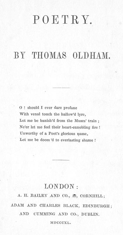 The Project Gutenberg EBook of Poetry, by Thomas Oldham This eBook is for the use of anyone anywhere at no cost and with almost no restrictions whatsoever. You may copy it, give it away or re-use it under the terms of the Project Gutenberg License included with this eBook or online at www.gutenberg.org Title: Poetry Author: Thomas Oldham Release Date: February 23, 2013 [EBook #42181] Language: English Character set encoding: ISO-8859-1 *** START OF THIS PROJECT GUTENBERG EBOOK POETRY *** Produced by D Alexander, Paul Marshall and the Online Distributed Proofreading Team at http://www.pgdp.net (This file was produced from images generously made available by The Internet Archive)