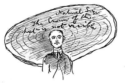 Here it raineth always, and this Soul of me is slowly evaporating, despite the perusal of Marcus Aurelius Antoninus, who spake of souls. Meseems that each time I behold the eyes of her concerning whom I spake to thee, something of that soul is drawn out unto her, and devoured perhaps for sustenance of that Jinneyah—which is her own soul. So that mine hath become thin as the inner shadow wrought by a strong double light upon the ground; and I shall become even as a vegetable presently—having knowledge of nothing save the witchery of God in the eyes of women. The memory of Schopenhauer hath passed,—and with its passing I find my only salvation in a return to the study of the Oceanic Majesty and Power and Greatness and Holiness and Omniscience of the mind of Herbert Spencer.