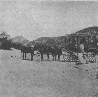 We had been traveling east, but here we were to turn north across the mountains, through Hesperia and Victor to Daggett. As yet we had not had the harness on Dixie, although we had been assured that she was broken to drive, but whether she would work in the lead and pull was a question which was soon to be answered. Climbing into my seat and picking up the lines, I let off a whoop and the brake at the same time, while the Doctor let fly a handful of pebbles, and we were off. We got into the road safely and by the time we had made a few miles up the mountain trail we concluded our lead horse would do.