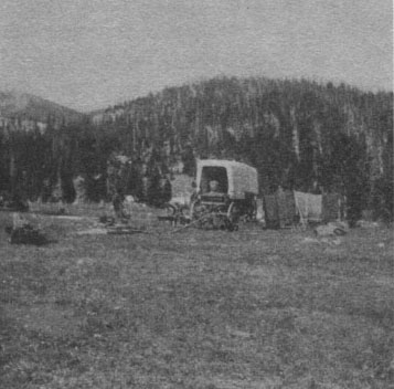 The road followed a mountain stream, winding ever upward, sometimes on a level with the stream, but usually cut out of the side of the mountain. Behind us we caught glimpses of mountains and valleys, and realized we were climbing up rapidly, but finally we got so far into the mountains that we could see very little, and our attention was given up entirely to the road and the horses. Bob and the Doctor walked ahead to lighten the load and signal back if any teams were coming down, so that we could pick out a safe place to pass. Noon brought us to a sandy place beside the stream, here only a rivulet, where we stopped for lunch.