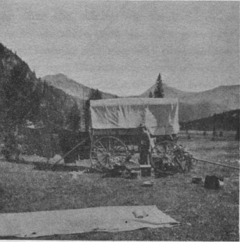 The two men on the front seat were Robert Lancaster and the writer; the tall man on the bay mare was Doctor Lancaster. We had stored inside the wagon our provisions, bedding, tools, tent, cots, horse feed, etc. We also carried an extra single-tree and clevis, together with a single harness for use in case it should become necessary to use all three horses.