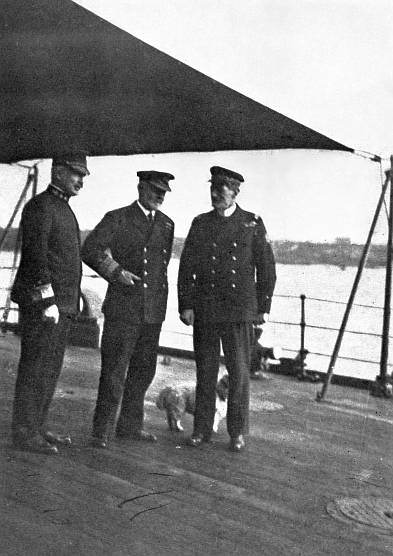 [17] Three men, each carrying a small suit-case, came over the side and saluted the officer of the day and the intelligence officer of the admiral's staff, who awaited them at the head of the gangway. The first was a three-stripe officer of the rank the Germans call Korvettenkapitän, the second a warrant officer, and the third (as we presently were informed) a qualified merchant pilot. The Korvettenkapitän was slender of figure, and had a well-bred, gentlemanly appearance not in the least suggestive of the "Hunnishness" one associated—and with good reason, too, as subsequent experience proved—with the German naval officer. His flushed expression showed plainly that he felt deeply the humiliation of the task assigned him of taking the first enemy warships into a German harbour. His head remained bowed a moment after his final salute; then he took a deep breath, squared his shoulders, and asked to be conducted to the bridge at once in order to take advantage of the improved visibility in pushing on in through the minefields.
