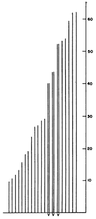 Fig. 7. Schematic representations of stripings with color changes indicated by symbols. Units consisting of pairs of warps represented by pairs of triangles. Chevron marks center of bilateral groupings of colors.