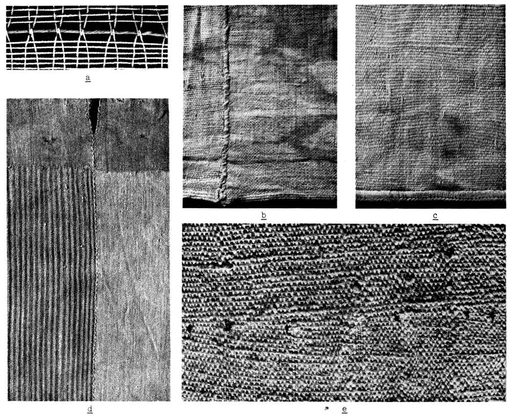 a, reconstruction of end-to-end warp locking, shown in d, by methods which make possible the change from monochrome to stripes; b, close-texture, semibasket weave with three heavy loomstring wefts at end selvage, whipped seam (16-1292); c, end selvage reinforced with needleknitting (16-1217) (cf. pl. 8,f, g); d, fine cotton garment material with stripes below monochrome section (16-1225), right-hand striped section faded; e, section of textile (×2) with turn of fill-in straightening wefts indicated by black threads (4-4056) (cf. pl. 8,a). Width of b and c, 3 inches.