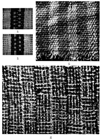 a, reconstruction of border stripes of fabric in plate 6,e; b, reconstruction of stripe found on several specimens; c, section of fabric (×2) showing variations in plain weave and amount of twist given to weaving elements (16-1240); d, section of fabric (×2) showing two-and-two basket weave varied in appearance by arrangement of colored yarns (4-3962).