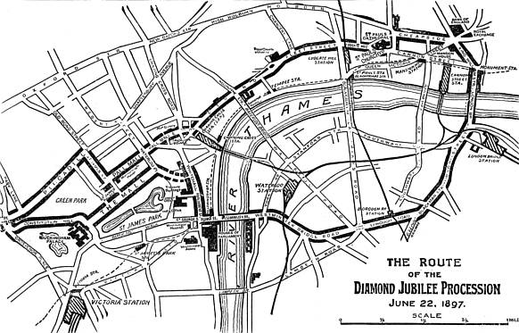 The Weather—A brilliant day for a brilliant pageant—The Queen’s Message to her people—The Colonial Procession—The Royal Procession—Loyal enthusiasm—The Queen’s reception at the City boundary—The Service at the steps of St. Paul’s—The halt at the Mansion House—In the Borough—Return to the Palace—Presents to the Queen—Congratulations from abroad—The Royal Dinner.
