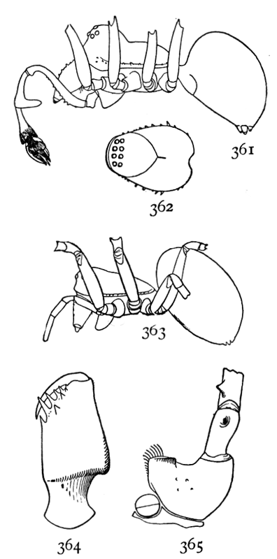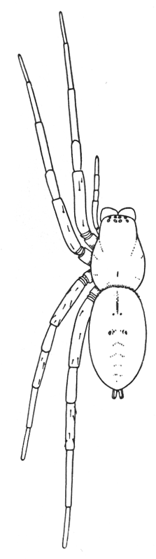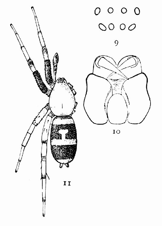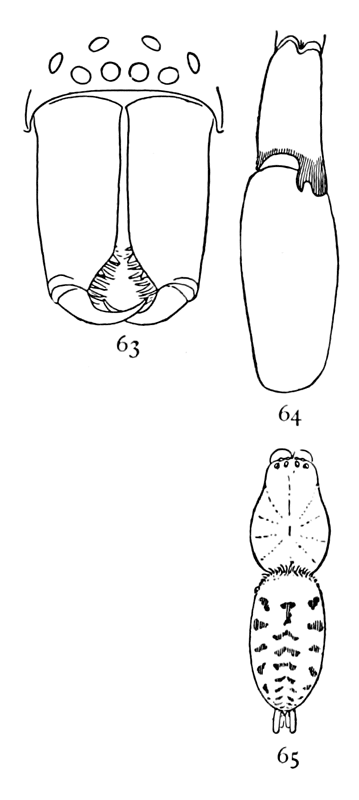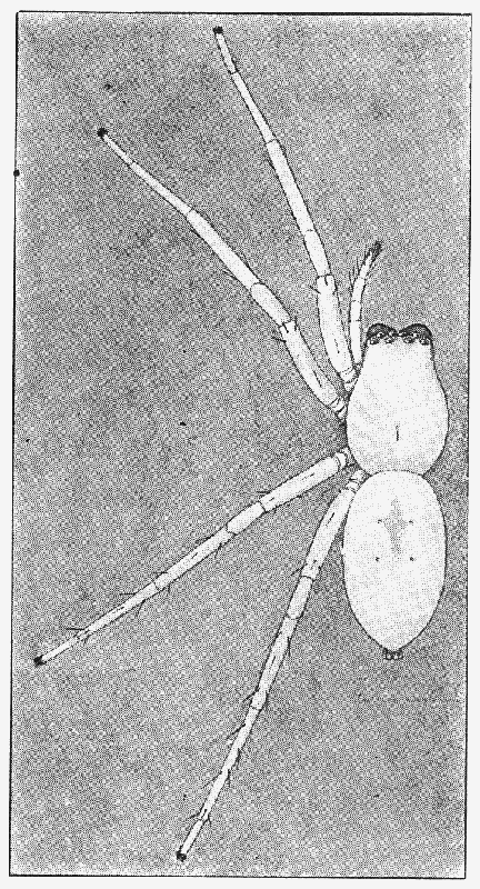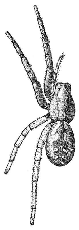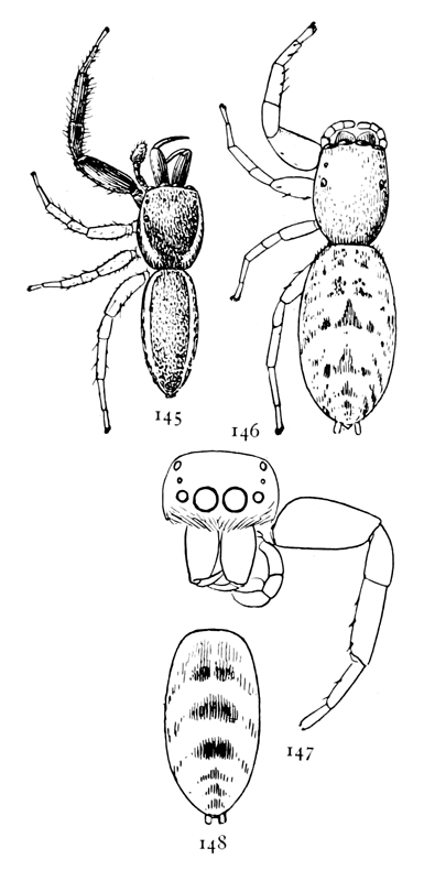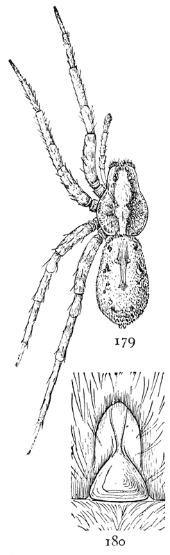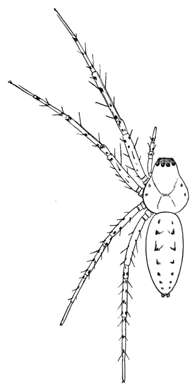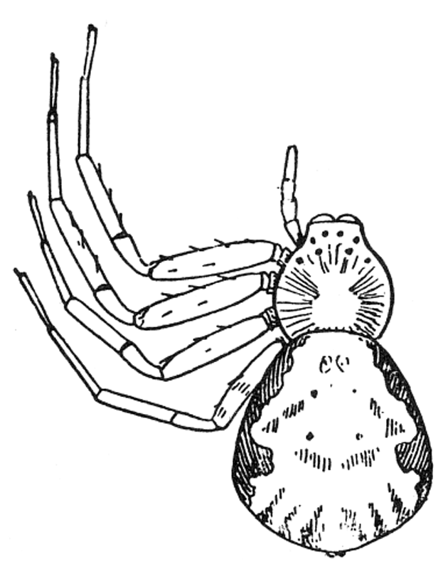 In the following pages a general description is given of each family, followed by descriptions of the species belonging to it, with a figure of each species placed as near as possible to the description. In some cases, where the genera are large and well defined, separate descriptions are given of each genus, but where the genus is not easy to distinguish or represented by only a few species, there is no separate generic description, and the species are placed next to those of other genera to which they are most closely related. If the names of spiders are known, they can readily be found by the index at the end of the book. If information is sought about an unknown spider, the illustrations through the book furnish the most convenient index, as the general form and proportions of spiders and the arrangement of their eyes usually show to what family they belong. The ground spiders and those without cobwebs are described first, and the sedentary species living in webs in the last half of the book. Readers unfamiliar with the subject are advised to read first the descriptions of the families and compare with them the spiders that they find in their own neighborhoods. The figures are in most cases enlarged for the sake of distinctness, and spiders of much smaller size must be looked for.