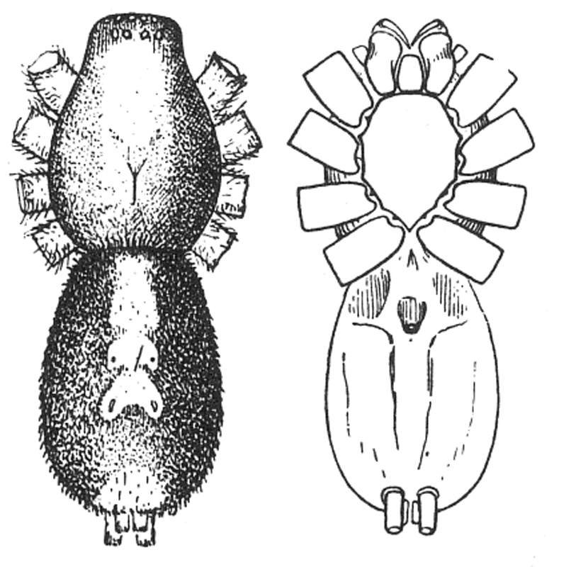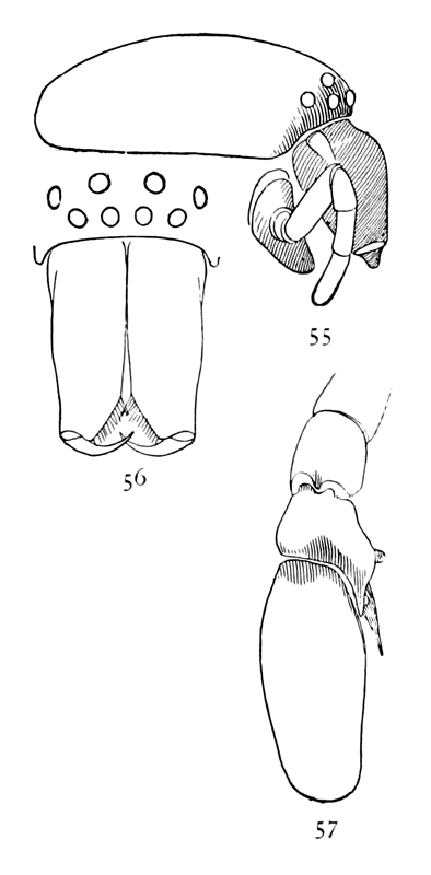 1. Prosthesima, Gnaphosa, Pœcilochroa, Pythonissa, and Drassus, which are generally dark in color and flattened above,[Pg 2] with the cephalothorax narrow in front and the eyes covering about half the width of the head and differing in their relative positions among the different genera. The labium is long and the maxillæ slightly widened at the end, or with the outer corners rounded off and sometimes a crease or depression in the middle. The joints of the first legs are sometimes thickened in the middle. The lower spinnerets are longer than the others and flat on the end.
