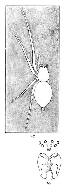 Tetragnatha straminea.—A quarter to three-eighths of an inch long, about the same size as laboriosa, and the same color. The legs, palpi, and mandibles are all a little longer than in laboriosa, and the lateral eyes are farther apart than the middle pairs (fig. 464). In the males the abdomen is shorter and smaller, and the legs longer. The male palpi (fig. 468) are one and a half times the length of the cephalothorax. In females the abdomen is usually three times as long as the cephalothorax and more slender than in laboriosa.