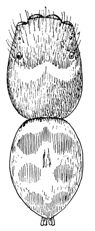 Amaurobius (Titanœca) americana.—Quarter of an inch long and deep black, except the cephalothorax, which is dull orange color, but covered, like the rest of the body, with long black hairs (fig. 493). Some individuals have a few light gray spots in pairs on the abdomen. The shape of the cephalothorax and abdomen are like Amaurobius sylvestris, and the legs are of the same proportional length and stouter. The palpi of the female have the tibia and tarsus a little thickened. The[Pg 216] metatarsus of the fourth legs has the calamistrum more distinct than in others of the family, and the metatarsus appears thicker up and down than it is sidewise. The male has the legs longer, particularly the first pair, of which the tibia and metatarsus are more elongated than the other joints, and have many small spines on the under side. The male palpi have the tarsus large and round, supported by a wide and very complicated tibia. It lives under stones in the hottest and dryest places.