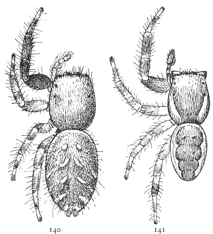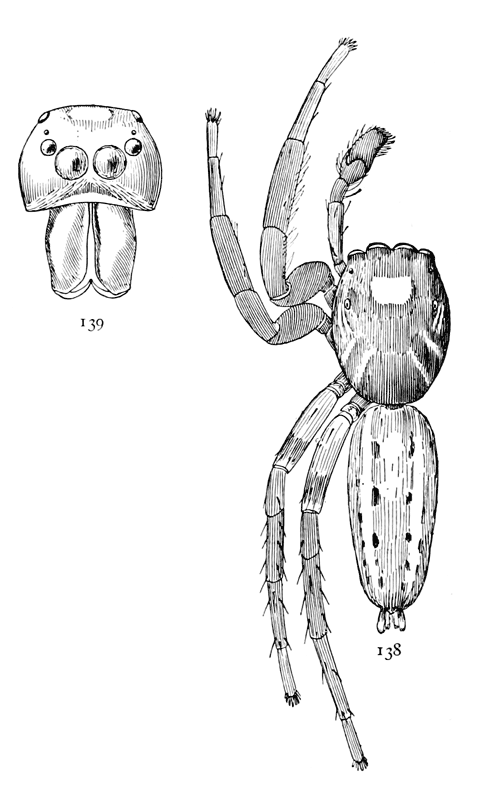 The hunting spiders include: (1) the Dysderidæ (p. 22), a few species with six eyes only and with four breathing holes at the front end of the abdomen; (2) the Drassidæ (p. 1), or ground spiders, which live among stones and dead leaves or among plants, making tubular nests and flat egg cocoons but no cobwebs; (3) the Thomisidæ (p. 24), the flat and crab-like spiders living on plants or under bark and stones; (4) the Attidæ (p. 41), the jumping spiders, with wide heads and large front eyes, many of them brightly colored and active in their habits; (5) the Lycosidæ (p. 67), the long-legged running spiders, living on the ground and, a few of them, in holes and carrying about their round egg cocoons attached to the spinnerets.