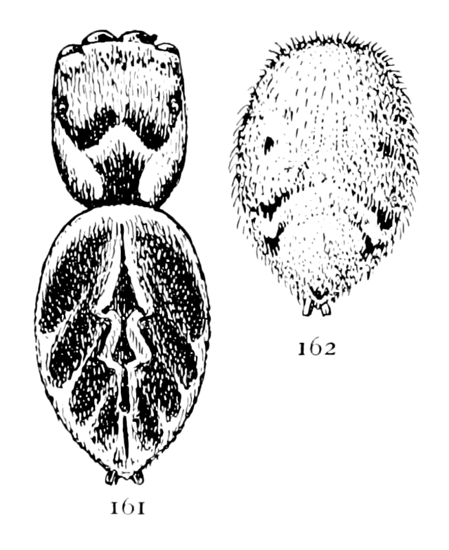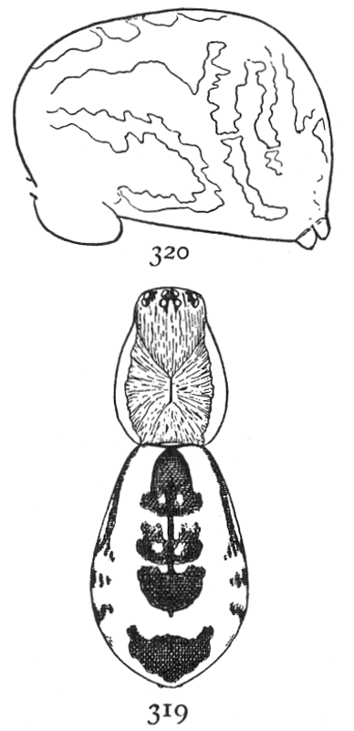 Some species live on walls and fences, making large webs that become conspicuous from the dust which they collect. Others prefer the tops of plants like stiff grass and the tops of golden-rod and spiræa. Others, like volupis (fig. 474), prefer leaves and the ends of growing branches. The webs are usually irregular, but sometimes are nearly round and formed by threads radiating from the spider's hole, crossed irregularly by other threads (fig. 471).