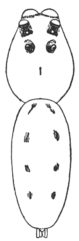 The Drassidæ, like the Lycosidæ (p. 67), are ground spiders, though some genera, like Anyphæna (p. 12) and Clubiona (p. 15), are equally common in summer on bushes. They make nests in the form of a bag or flattened tube, but no cobwebs for catching insects, and are commonly found running about among dead leaves and short grass and sometimes even on bare ground and sand. In form they are usually two or three times as long as they are wide, like the Lycosidæ (p. 67), but more often flattened on the back. The legs differ but little in length, and the first and second pairs are directed forward, the third and fourth backward. Their hairs and spines are short, giving them a smooth, velvet-like appearance. The feet have two claws, with a brush of flattened hairs under them, like the Thomisidæ and Attidæ (p. 41), but unlike the Lycosidæ (p. 67), which have three claws. The mandibles are large and strong and are together as wide as the head. The eyes are all about the same size and arranged in two rows of about the same length and not far apart, but between different species there are slight differences in their arrangement. The colors are usually dull gray, brown, and black, with few markings or none. A few species are very brightly marked, as in Micaria (p. 9) and Pœilochroa (p. 4).