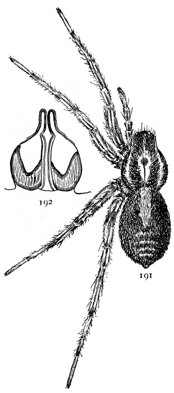 Amaurobius ferox.—This lives in houses and is probably an imported species, as it is more common in Europe. It grows a little larger than sylvestris (fig. 489), and the head is a little more narrowed in front of the legs. The colors and markings are much as in sylvestris, but the abdomen is often darker, and the middle light stripe on the front more distinct. The epigynum has a larger middle lobe, and the lateral lobes are straighter and do not meet in the middle. The males are colored like the females and have the thorax wider and the legs longer. The palpi of the male have the tarsus short and round. The tibia (fig. 492) has only a small short hook on the inner side, and a large blunt process on the outer side. The male palpi and the epigynum distinguish these easily from the last species.