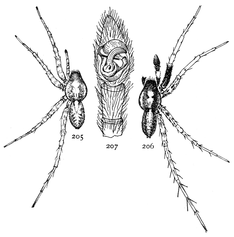The male is smaller and more slender, with the legs longer. The male palpi are one-half longer than the cephalothorax, the femur forming nearly half its length (fig. 466).