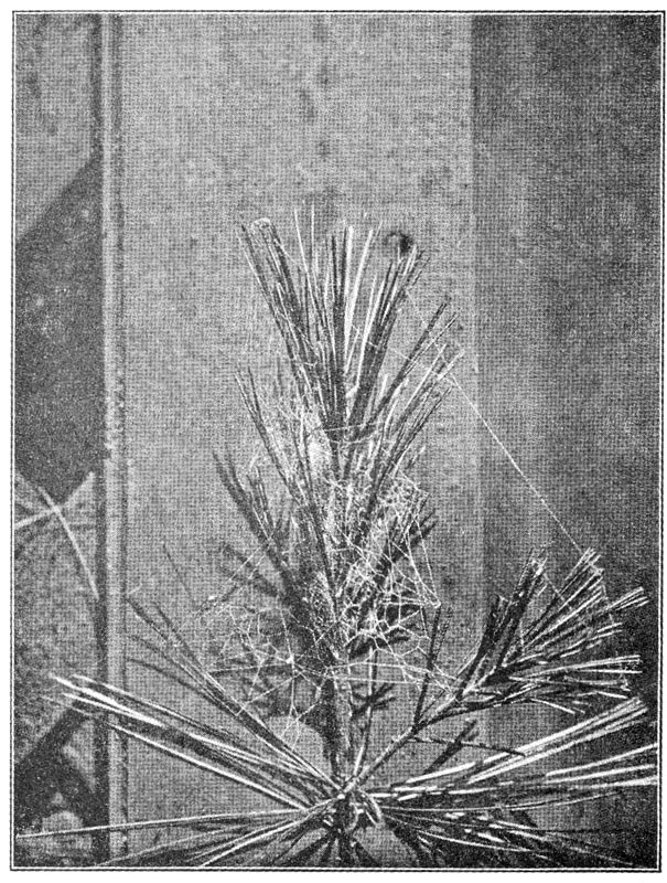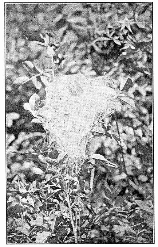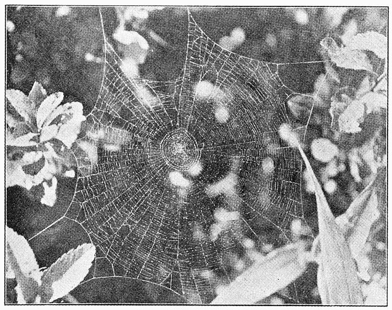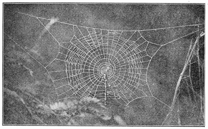 1. The flat webs, closely woven of long threads crossed by finer ones in all directions and connected with a tubular nest where the spider hides, and from which it runs out on the upper side of the web after insects that may fall upon it. These are made by Agalena and Tegenaria (pp. 91 to 104).