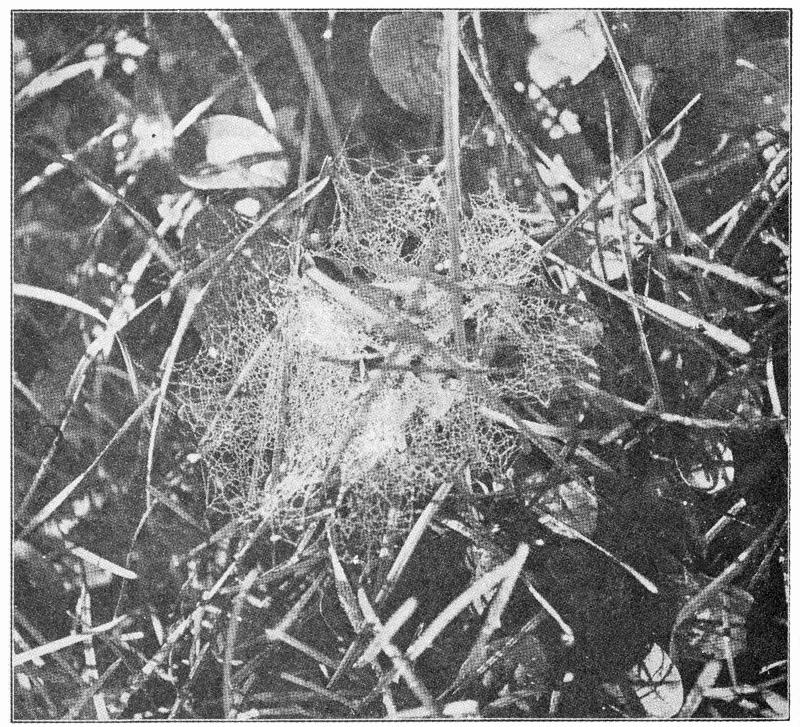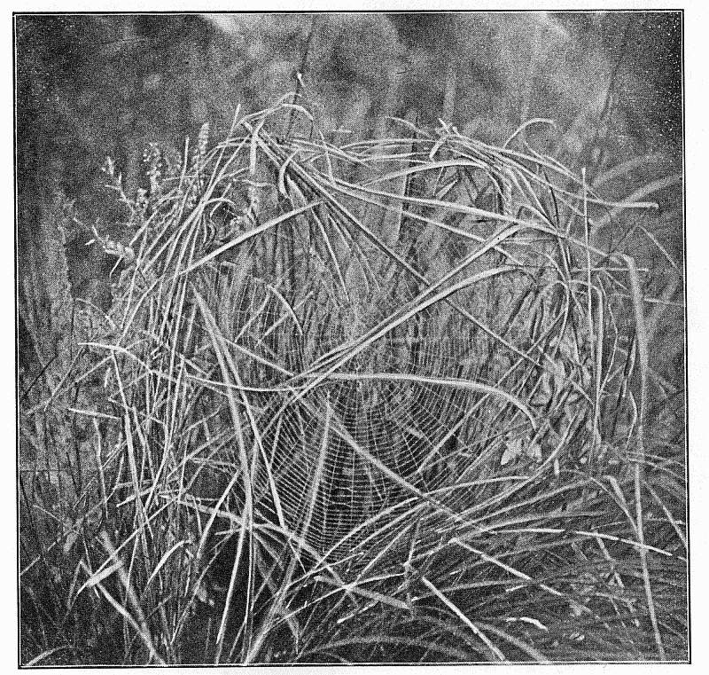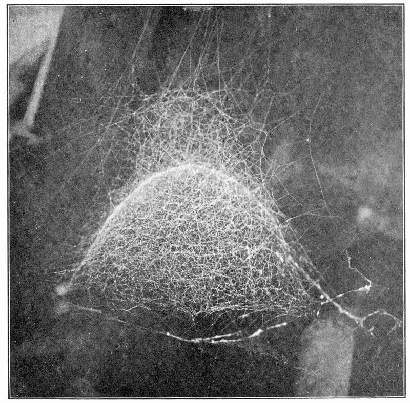 2. The net-like webs, made of smooth threads in large meshes, sometimes in a flat or curved sheet held out by threads in all directions. The spider lives on the under side, back downward. These are made by Therididæ and Linyphiadæ (pp. 107, 134).