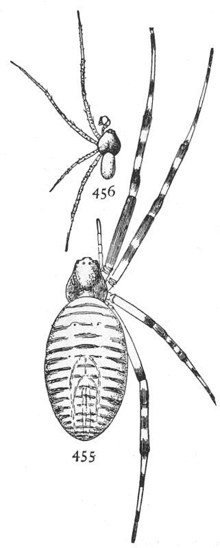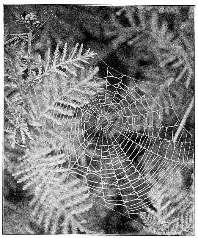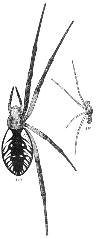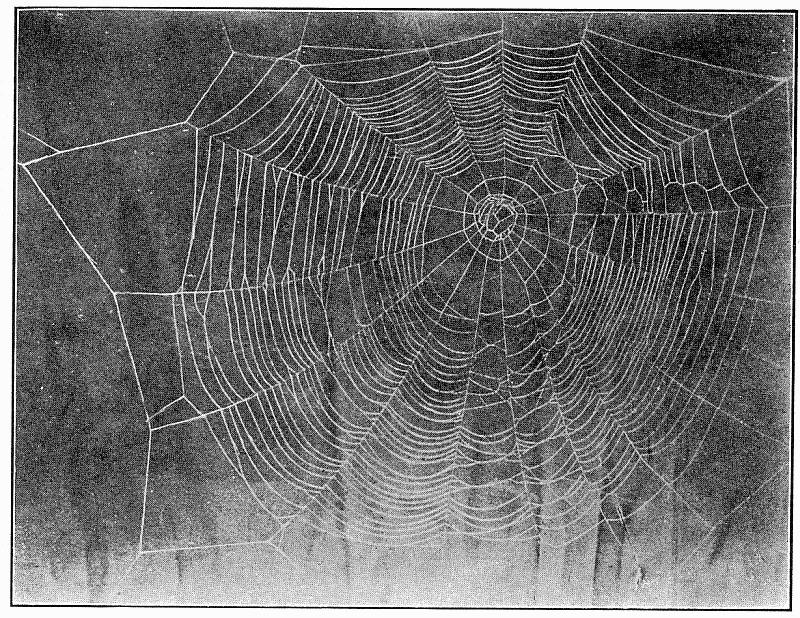 The web (fig. 500) consists of four rays crossed by a dozen or more threads. The point where the rays meet is attached to a thread which extends to the spider's roost, usually the end of a twig. Here it holds on by the hind feet and draws the thread tight with the fore feet. When an insect strikes the web the spider lets go with the hind feet and is jerked forward by the contraction of the web, and slides along toward its[Pg 220] center, where it finds the prey and takes it out of the web to its perch. The making of this web has been described by Wilder in the Popular Science Monthly in 1875. The cross threads are made separately, beginning with the longest. They are begun on the upper ray, the spider walking toward the center, combing out the threads with its hind legs, until it reaches a point where it can cross to the next. It is found all over the country, usually in the pine woods.