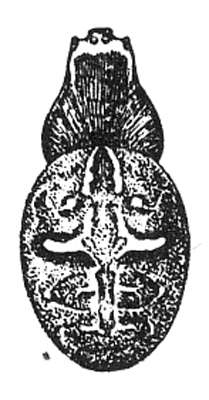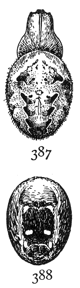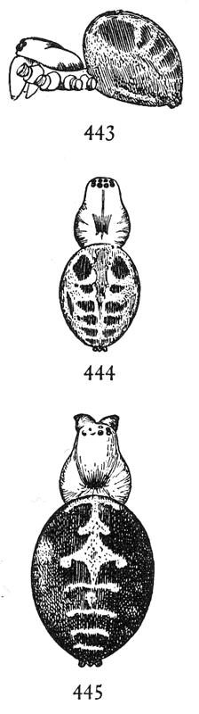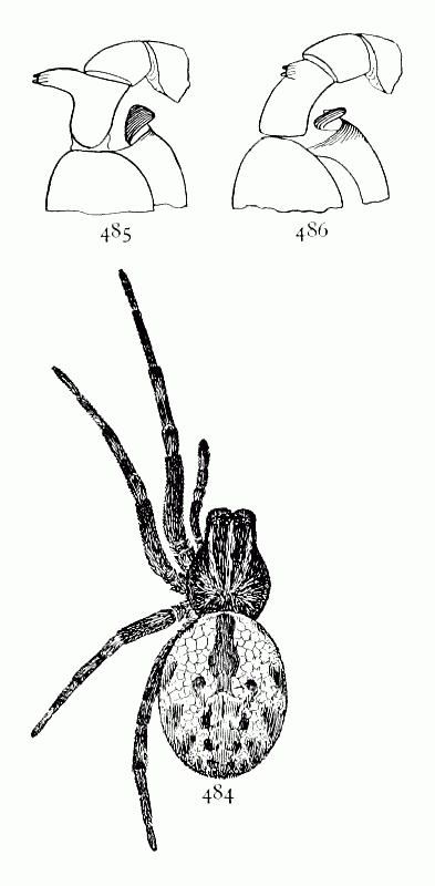 Dictyna cruciata.—About a tenth of an inch long, with the abdomen large and oval, as in muraria. The cephalothorax is light brown above and below, and the legs the same color, but still lighter. The abdomen is gray beneath and at the sides, and silvery white on the back, sometimes over the whole upper surface, but oftener in a stripe widened in the middle so as to form a white cross on a gray ground (fig. 482). The males are darker colored, with the light spot on the abdomen smaller. The male palpi are short and slender, the ends large and rounded and carried close to the head (fig. 483).