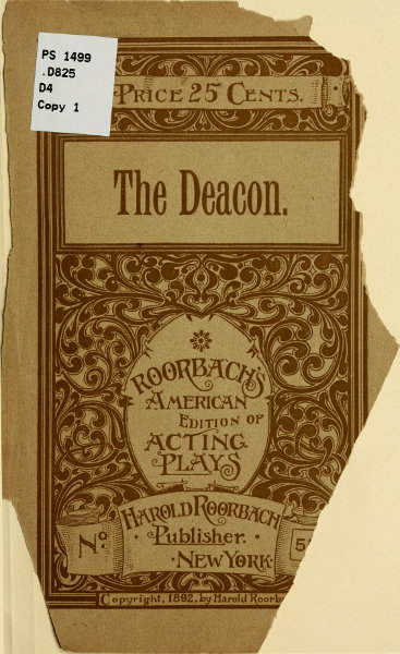 Act V. Scene, Mrs. Thornton's sitting-room. The Deacon in clover. An interruption.—"Hang the Parson!"—The interrupted marriage ceremony.—"That man has a wife living."—"'Tis false!"—An attack.—Pete to the rescue.—"No, it is a forgery."—The villain foiled.—Arrest of George Darrah.—Reinstatement of Graef.—Refusal of a hand.—The Deacon is obstinate.—"I can't help it, Minnie, I mean it."—Mrs. Darrah and Nellie forgiven.—"Oh, Deacon, don't be so silly."—The Deacon made happy. Curtain.