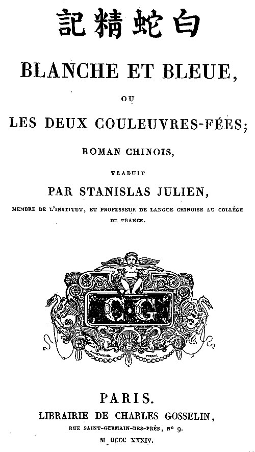 [1] Les quatre caractères chinois placés au-dessus du titre, se prononcent PÉ-CHÉ-TSING-KI, c'est-à-dire, l'Histoire de l'Esprit de la Couleuvre blanche; le titre que nous avons adopté nous a paru donner une idée plus juste de l'ouvrage.
