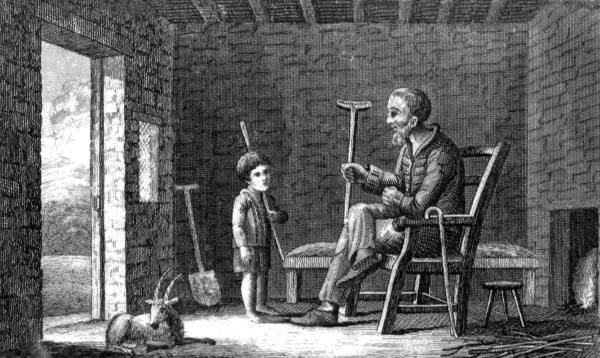 In a short time Little Jack was completely master of his legs; and as the summer came on he attended his mammy, the goat, upon the common, and used to play with her for hours together, sometimes rolling under her belly, now climbing upon her back, and frisking about as if he[Pg 7] had been really a kid. As to his clothing, Jack was not much incumbered with it; he had neither shoes, nor stockings, nor shirt; but the weather was warm, and Jack felt himself so much the lighter for every kind of exercise. In a short time after this Jack began to imitate the sounds of his papa the man, and his mama the goat; nor was it long before he learned to speak articulately. The old man, delighted with this first dawn of reason, used to place him upon his knee, and converse with him for hours together, while his pottage was slowly boiling amid the embers of a turf fire. As he grew bigger, Jack became of considerable use to his father: he could trust him to look after the gate, and open it during his absence; and as to the cookery of the family, it was not long before Jack was a complete proficient, and could make broth almost as well as his daddy himself. During the winter nights, the old man used to entertain him with stories[Pg 8] of what he had seen during his youth; the battles and sieges he had been witness to, and the hardships he had undergone; all this he related with so much life, that Jack was never tired of listening. But what delighted him beyond measure, was to see his daddy shoulder his crutch, instead of a musket, and give the word of command. To the right—to the left—present—fire—march—halt. All this was familiar to Jack’s ear as soon as he could speak, and before he was six years old, he poized and presented a broom-stick, which his daddy gave him for that purpose, with as good a grace as any soldier of his age in Europe.
