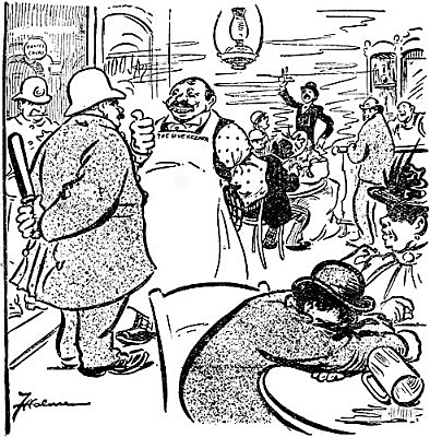 The whole story of the alliance between the police, the saloons and the justices is told in the following cartoon taken from the Daily News of June 23, 1899.