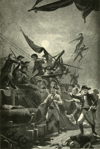 Paul Jones had given orders to drop hand-grenades from the rigging down into the hold of the Serapis, through her main hatchway, which was open. By this same means the enemy had been set afire at various times before. Now, at an opportune moment, a hand-grenade fell among a pile of cartridges strung out on the deck of the Serapis. A terrific explosion occurred, killing many of her men.