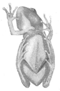 Four days later Hyla ate up this new suit. I saw the entire operation this time. It was almost a case of surgery. He pulled the skin over his head and neck with his fore feet as if it were a shirt, then crammed it into his mouth; kicked it over his back next; worked out his feet and legs; then ate it off as before. The act was accomplished with difficulty, and would have been quite impossible had not Hyla found the most extraordinary of tongues in his head. Next to the ability to speak Russian with the tongue comes the power to skin one's self with it. The tree-toad cannot quite croak Russian, but he can skin himself with his tongue. Unlike ours, his tongue is hung at the front end, with the free end forked and pointing toward his stomach. When my little captive had crammed his mouth full of skin, he stuck this fork of a tongue into it[Pg 308] and forced it down his throat and held it down while he kicked and squirmed out of it.
