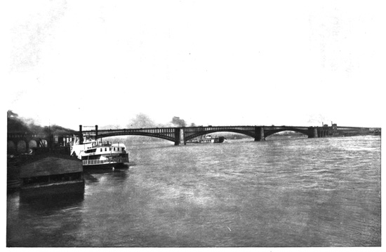 A large portion of the waters brought down by the Ohio come from its two great affluents flowing in almost alongside each other on the southern bank, just above Paducah, the Cumberland and Tennessee Rivers. The Cumberland has its sources in the Cumberland Mountains, the eastern boundary of Kentucky, and flows for six hundred and fifty miles, the whole length of that State, making a wide, sweeping circuit down into Tennessee, where it passes Nashville, at the head of steamboat navigation, two hundred miles from its mouth. For twenty miles above their mouths, in their lower courses, these two great rivers are rarely more than three miles apart. The Tennessee is twelve hundred miles long from its head stream, the Holston River, rising in the mountains east of Kentucky and Tennessee. It comes through East Tennessee, makes a great bend down into Alabama, and then coming up northward flows through Tennessee and Kentucky to the Ohio. It is navigable for nearly three hundred miles to the Mussel Shoals at Florence, Alabama, where canals and locks have improved the navigation for twenty miles past the shoals, and it can also be navigated for eight hundred miles above, excepting at very low stages of water. Its name signifies "the river of the Great Bend," and it was also called in early times the "river of the Cherokees." 344