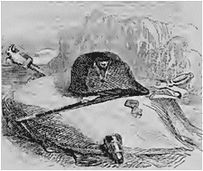 «D'autres fois, lorsque le sol est humide et qu'on a remarqué des traces de leur passage, les Arabes se réunissent au nombre de vingt ou trente; ils s'arment de piques et de fusils et suivent les traces aperçues. A mesure qu'elles s'effacent, ils se rapprochent de la retraite du lion et, au point où elles disparaissent tout à fait, ils décrivent un demi-cercle; les porteurs de piques marchent les premiers, les autres suivent. Lorsqu'ils découvrent le lion, ils forment le cercle entier et l'y enferme. La bête épouvantée veut fuir, elle tourne de tous côtés sans trouver d'issue; les piques lui barrent le passage. Enfin, après qu'elle a fait de nombreuses tentatives, on ouvre le cercle; elle va s'élancer, mais une décharge du second rang la prévient, et elle retombe mourante sur les piques.
