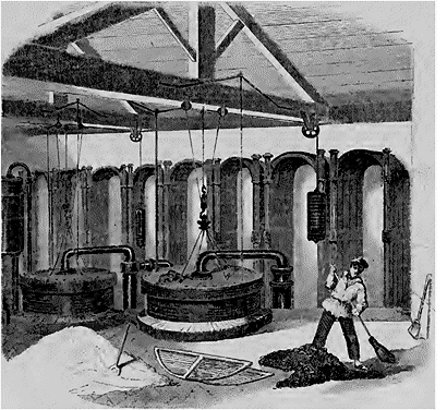 La fabrication du gaz offre, un curieux, un imposant coup d'œil. La compagnie Parisienne, qui est située à la barrière d'Italie, et qui a un des parcours les plus étendus, sinon encore les plus fournis de becs, la compagnie Parisienne a bien voulu admettre nos dessinateurs dans son usine. Leur crayon donnera à nos lecteurs une idée de l'étendue, de l'immensité de ces sortes d'établissements. Mais il lui manquera la couleur pour bien rendre ces fournaises, ce rouge cerise devant lesquels seraient bien pâles les forges de Vulcain à l'Opéra. Cinquante fourneaux, rangés dans l'atelier de distillation, font dégager de la houille ce gaz qui doit se répandre sur Paris en torrents de lumière. Pour retirer le gaz inflammable, la houille est mise dans des cornues continuellement exposées à la chaleur rouge. Cette chaleur leur est communiquée par des fourneaux placés immédiatement au-dessous, ainsi qu'on le voit dans la gravure représentant l'atelier de distillation. Le gaz s'échappant des cornues passe dans un appareil de forme cylindrique et allongé, à travers lequel, après avoir plongé dans l'eau où il dépose les parties bitumineuses qu'il entraînait avec lui, il est dirigé vers l'atelier d'épuration où il circule dans nue foule de tuyaux destinés à le refroidir et où il est mis en contact avec la chaux qui le débarrasse de son hydrogène sulfuré. De là enfin il se rend dans le gazomètre, d'où il ne sort plus que pour la consommation.
