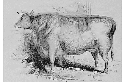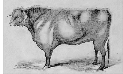 On a prétendu que les descendants des animaux produits par un accouplement entre pioches parents dégénéraient, c'est-à-dire perdaient les qualités distinctives de leur race. Je ne discuterai point cette opinion, mais quant à l'espèce du bœuf en particulier, elle ne me paraît qu'une hypothèse basée sur des observations vicieuses et incomplètes; l'expérience ne l'a jamais confirmée, et elle est en opposition avec un grand nombre de faits positifs. Nous pouvons montrer, par un exemple remarquable, la vérité de cette assertion. Au grand meeting de Derby en 1843, M. W. Barnard, Esq., présenta un taureau dont nous donnons ici le portrait scrupuleusement exact.