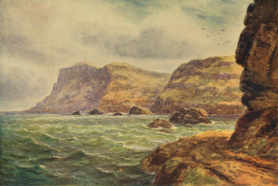 This Antrim coast has one charm distinguishing it above the rest of Ireland—its variety of geological formation. At the foot of Glen Ariff, Red Bay is called after the sandstone cliffs past which the road is cut, and in one place the rock makes an arch near an old castle. There is a cave, too, at various times inhabited. At Fair Head one reaches the basalt, and this huge promontory faces the sea with cliffs whose[Pg 21] columnar formation gives that odd suggestion of human workmanship which reaches its climax at the Causeway. This black basalt with the numberless fissures is a good rock for birds to build in, but a very bad and treacherous dependence for those who climb to pry after their nests. Beyond the Causeway comes a line of white chalk cliff, such as is familiar to all in the south of England, but very strange to us in Ireland; though the sea off the Antrim coast is too deep to have that opaline appearance—as though milk were spilt into it—which the Margate tripper knows.