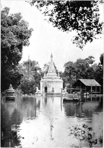 Of Rangoon in those early days, separate mention may be made. One glory it had which still abides. The Shwe Dagôn Pagoda, most sacred and most illustrious of pure Buddhist shrines, dominating the landscape, rose golden to the sky. From far the traveller approaching Rangoon from the sea caught sight of that amazing shaft of gold, and instinctively did reverence. In the bright winter sunshine, in the blue haze of summer heat, in the veiled mysteries of tropic moonlight, it towered awe-inspiring, stupendous, divine. On feast days and sabbaths the platform was thronged with worshippers, surely the brightest, best-humoured, most laughter-loving of all pious crowds. Even now one can imagine no scene more gracious, more mystically serene and lovely, than the pagoda in the light of the full moon, when all that is tawdry and unseemly is charmed away. But thirty years ago, before the platform was covered with modern shrines not all in harmony with æsthetic canons, it was still more gravely and austerely beautiful.