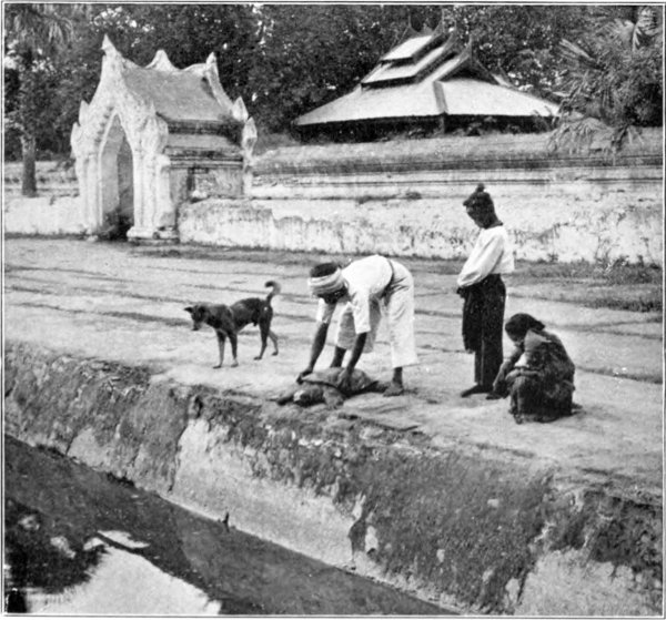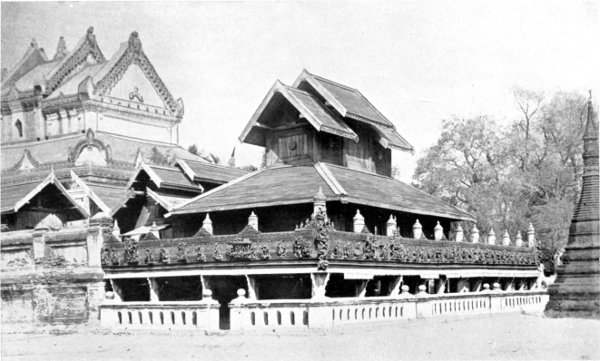 The main lines of the plan of Rangoon have been preserved, and are as at first designed. But the past thirty years have seen many changes. In 1878, though there were many strangers within its borders, Rangoon was still a Burmese town. Now it is the third port in the Indian Empire,[18] a vast city of[Pg 13] over a quarter of a million of people, speaking a pentecostal variety of tongues, among whom Burmans are a dwindling minority. Then the cantonment, no doubt of needlessly vast extent, occupying a wide space on every side of the pagoda, was like a picturesque park, studded with little wooden houses, each surrounded by an ample shady garden. Halpin Road, by some sentimentalists called the Ladies’ Mile, with a humble but select gymkhana[19] at one end, was restricted to the use of the military and civil community. Now the gymkhana has been quadrupled in size, and far more than quadrupled in membership. Jehus of all races and classes raise the dust of Halpin Road in dogcarts, landaus, and motor-cars. A great modern hotel occupies a large space; houses of a decadent type, planted as close together as suburban villas, have devastated the pretty cantonment; natives of wealth and position live on sites once reserved for the sovereign race. Doubtless all these are signs of progress. But they shock the æsthetic sense. The Pegu Club was housed in Cheape Road, in a wooden building not long ago dismantled. On the Royal Lake a few boats afforded exercise and pastime. If your boat upset, you were fined for illegal bathing; and if you scrambled back into your boat, you were fined for embarking elsewhere than at the prescribed jetty. Dalhousie Park, it[Pg 14] may be gratefully admitted, has been much improved, mainly by the devoted attention of the late Mr. John Short. It is now beyond imagination the home of the picturesque, its lovely lawns and winding paths fringing the lake, with the pagoda shining in the middle distance. Except a few public offices, there were no buildings of importance. Government House was of wood, with a small masonry annexe, near the present imposing and luxurious, but hardly beautiful structure. A neighbouring house was used as a guest-house, to accommodate the overflow of visitors, till some years later it was sold by a frugal Chief. The General Hospital, of wood saturated with generations of microbes, was then, and for long after, a disgrace to civilization. It has now been replaced by a magnificent pile, the best-equipped hospital in the East, one of the best-equipped in the world. The race-course, round the parade ground, was about two-thirds of its present size. The little race-meetings twice a year, where one knew all the ponies and riders, when lotteries were of small value and attended by one’s friends and acquaintances, when bookmakers were unknown, and we did our mild gambling at the totalizator, were more enjoyable and more truly sporting than the present-day monthly meetings, where more than half the owners are Chinamen or Indians, and almost all the riders professional jockeys. In wealth, in luxury, in comfort, Rangoon has made great advances in the last thirty years. Yet I doubt if it is quite as pleasant a place of abode as it was a generation ago.