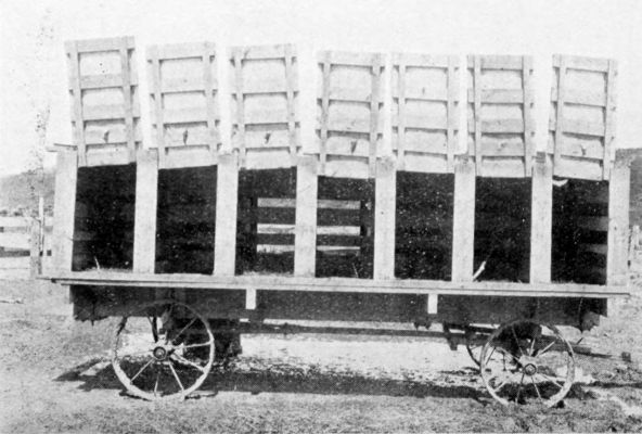 This is the lamb wagon, which brings the ewe and lamb to the shed from the pasture during the day. It is made of the same material as the individual pens above described, placed upon a low running gear, with a floor made of 1½-inch boards, with a 2 by 2-inch strip along each side to firmly hold the pens from any lateral or side motion. There are seven pens on each side, 14 in all. To[Pg 31] each gate and over the top and ends of the pens is tacked heavy canvas to exclude all rains and winds from the newly born lambs while they are being hauled from pasture to shed. Upon the range the ewe and lamb are sheltered during storms with a small "sheep tepee" until the "Pullman" arrives, which insures continual warmth for the lamb until he is placed in the shed. There is feed for the ewe in sacks in each of the 14 pens. Indicating flags or rags are hung on small nails on each gate to show the attendant at the shed, when the wagon arrives, the character of each ewe, that he may intelligently care for her and her lamb at once. The dimensions are: Length of floor, 14 feet; width of floor, 7 feet; length of panel, 6 feet 8 inches; width of gate, 22 inches; height of pens, 3 feet. This allows each ewe a space 39 inches long and 22 inches wide. Such a wagon will cost complete about fifty dollars. It will do the work for about 2,500 dropping ewes, when they are not pastured much more than one mile from the lambing shed.